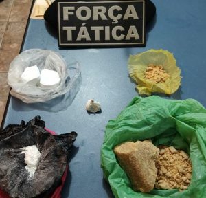 Em uma mesa da residência foi encontrado uma pedra bruta de crack enrolada em uma bexiga, totalizando 177 gramas, uma balança de precisão e $187 reais em notas fracionadas, que o autor disse ser proveniente da venda de drogas.