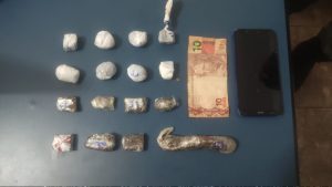 O embrulho continha 14 parangas de maconha, com o autor foi encontrado mais duas parangas, um celular Xiaomi e R$10,00, questionado sobre a origem do entorpecente, declarou ser de sua posse e que ele vendia por R$10,00 e outra por valores diferentes conforme descrito nas embalagens.