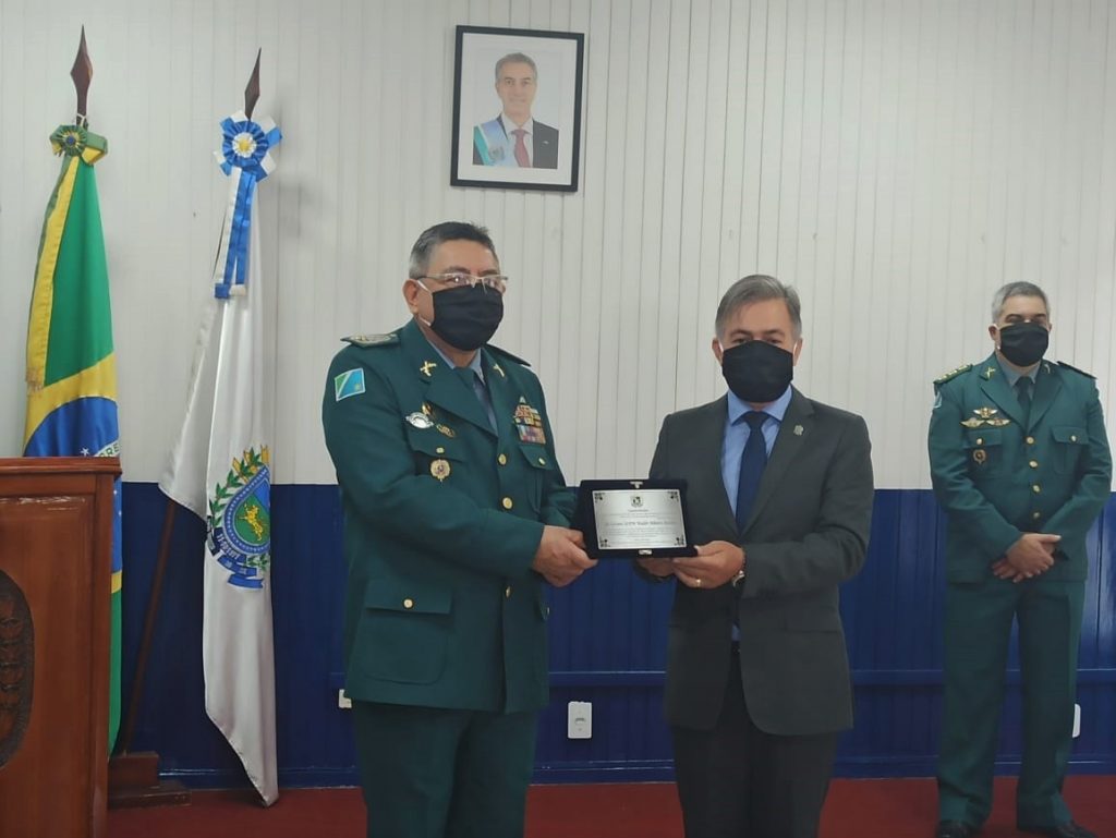 Foram prestadas homenagens, entregue uma placa de agradecimento e um presente ao Coronel PM Waldir Ribeiro Acosta, em reconhecimento ao profissionalismo, dedicação e afinco empenhados no período em que esteve à frente da PMMS não medindo esforços e dedicando-se integralmente em prol da instituição e toda a sociedade.