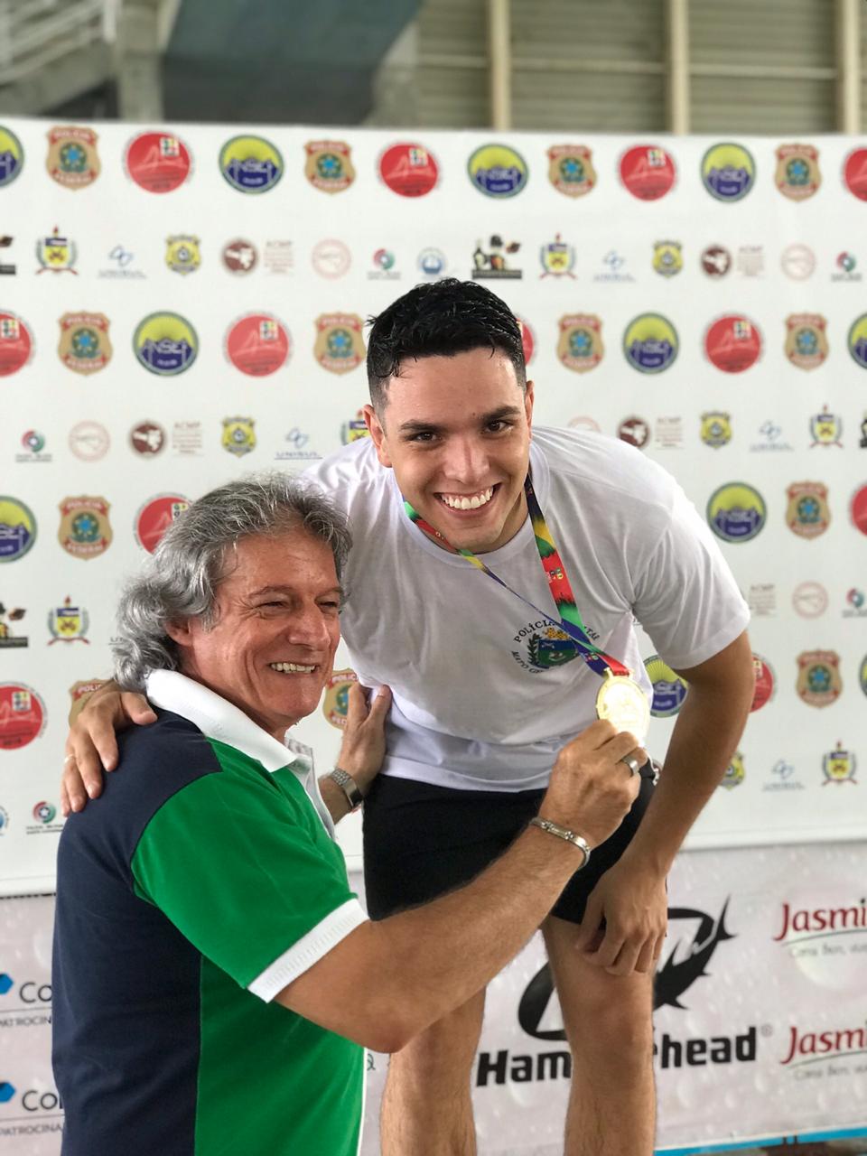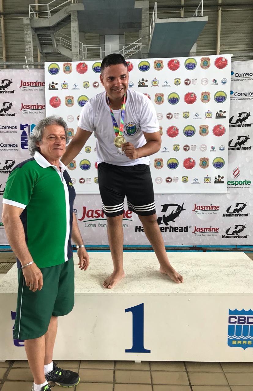 O cabo PM Peter do Batalhão de Polícia Militar de Trânsito – BPMTran, garantiu a medalha de ouro no 50 metros costas e prata no 100 metros peito .