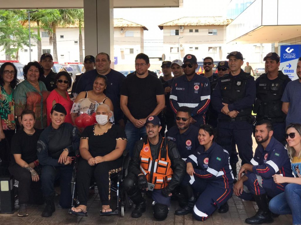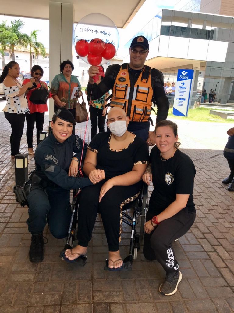Campo Grande (MS) – Na manhã desta quinta-feira (19), policiais militares do 1º Batalhão, recepcionaram a saída da jovem Madu, Maria Eduarda, 20 anos, após ela receber alta médica do Hospital da Cassems em Campo Grande, MS.