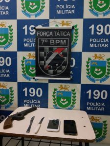 Sendo assim, a guarnição realizou abordagem e busca pessoal, encontrando no bolso de um dos autores um celular ainda com a foto de uma das vítimas, e uma faca. No local onde os autores dispensaram objetos, foram encontrados ainda, um celular, uma faca e um simulacro de arma de fogo de cor preta.