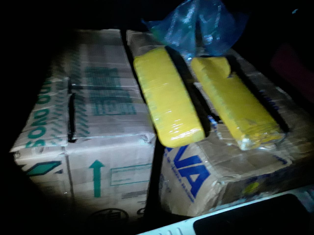 Durante a busca veicular, os policiais localizaram, no compartimento de bagagens, duas caixas de papelão contendo 69 tabletes de maconha e dois pacotes contendo 50 munições, sendo 25 munições calibre .357 e 25 munições calibre .38.