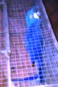 Durante a busca nas bagagens, os policiais localizaram, no interior do saco, uma Arara Azul (Anodorhynchus hyacinthinus) e, nas mochilas, foram localizados diversos materiais, como: rolos de corda, rondana, facão e lanterna.