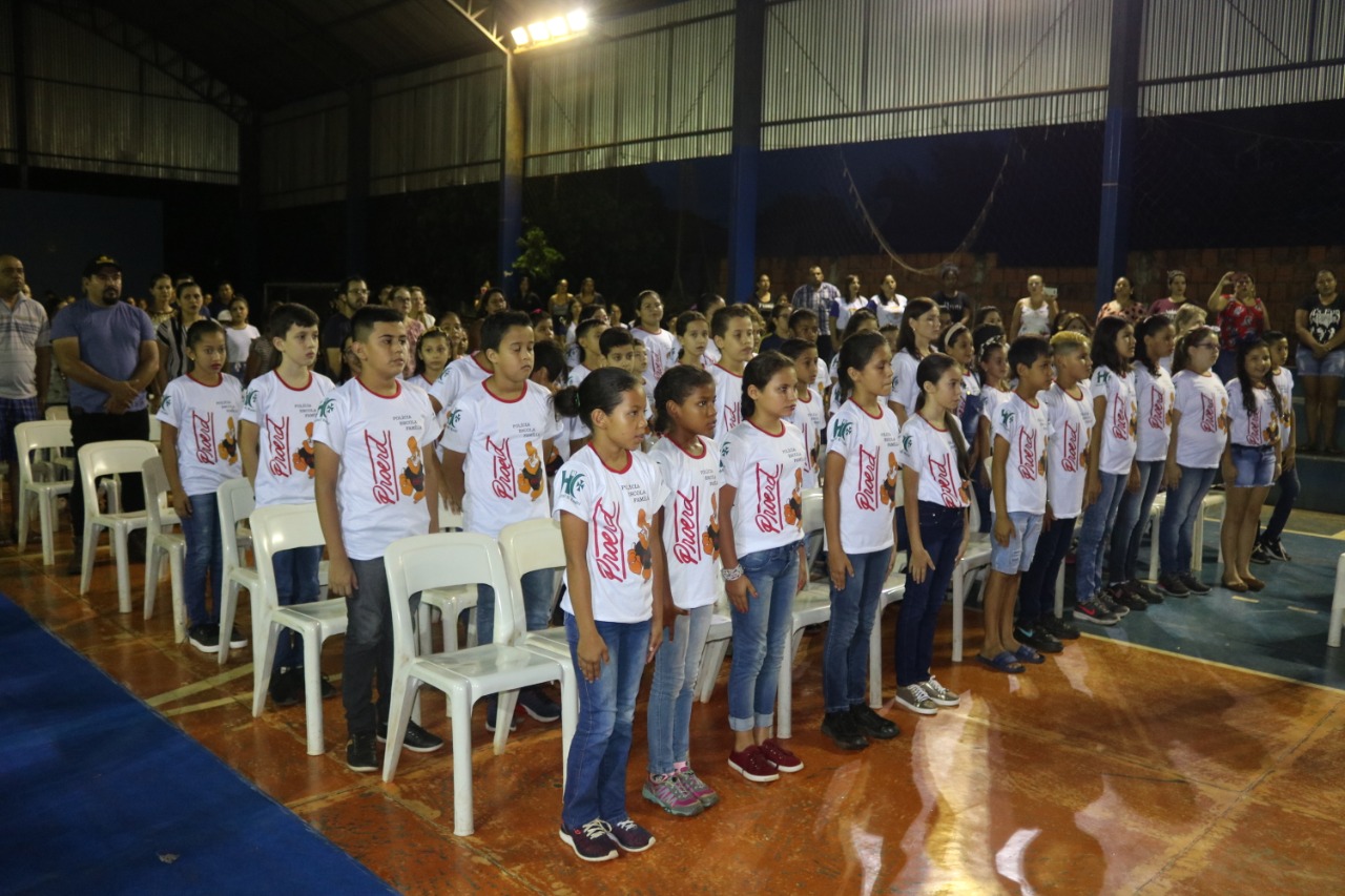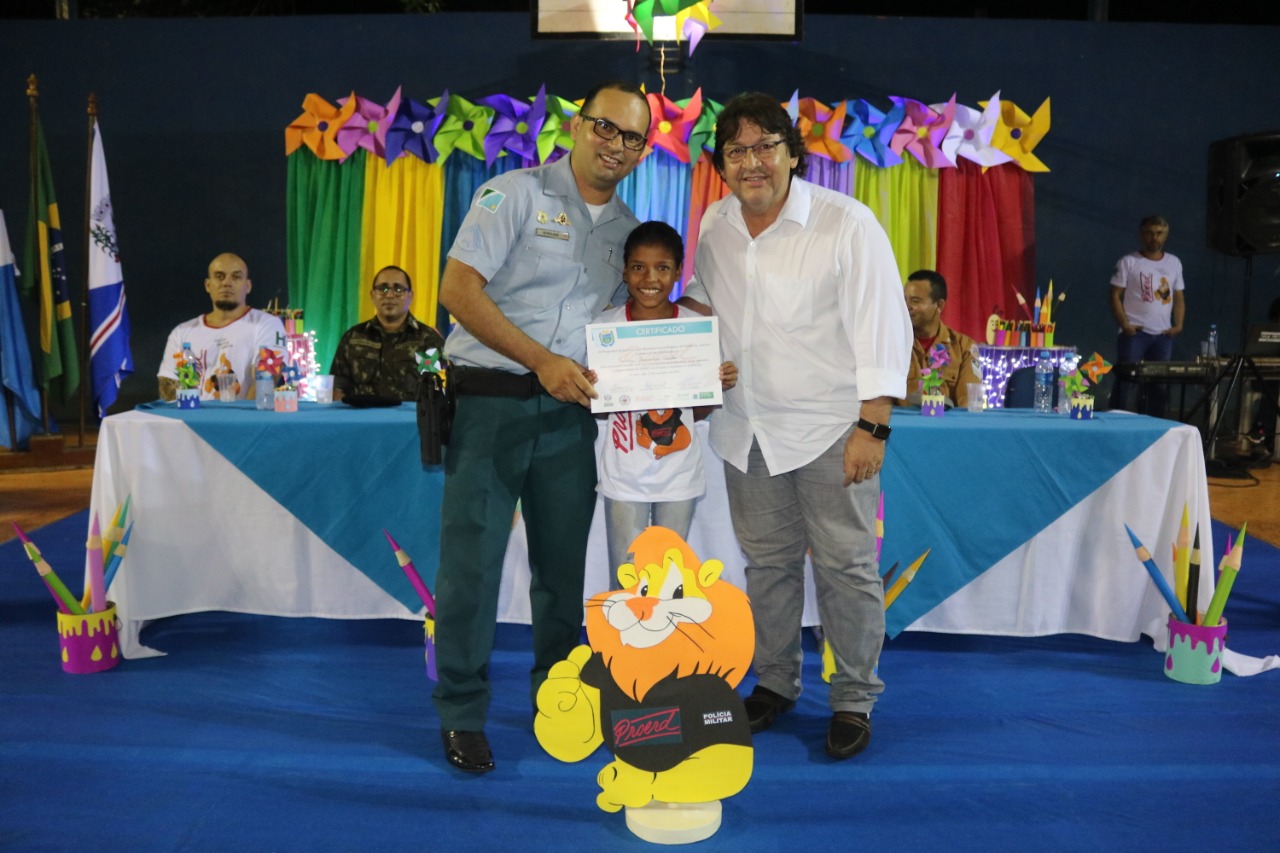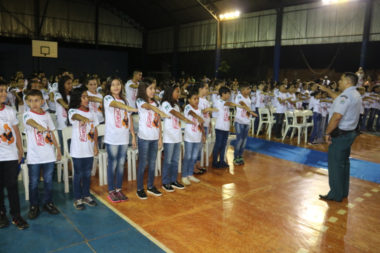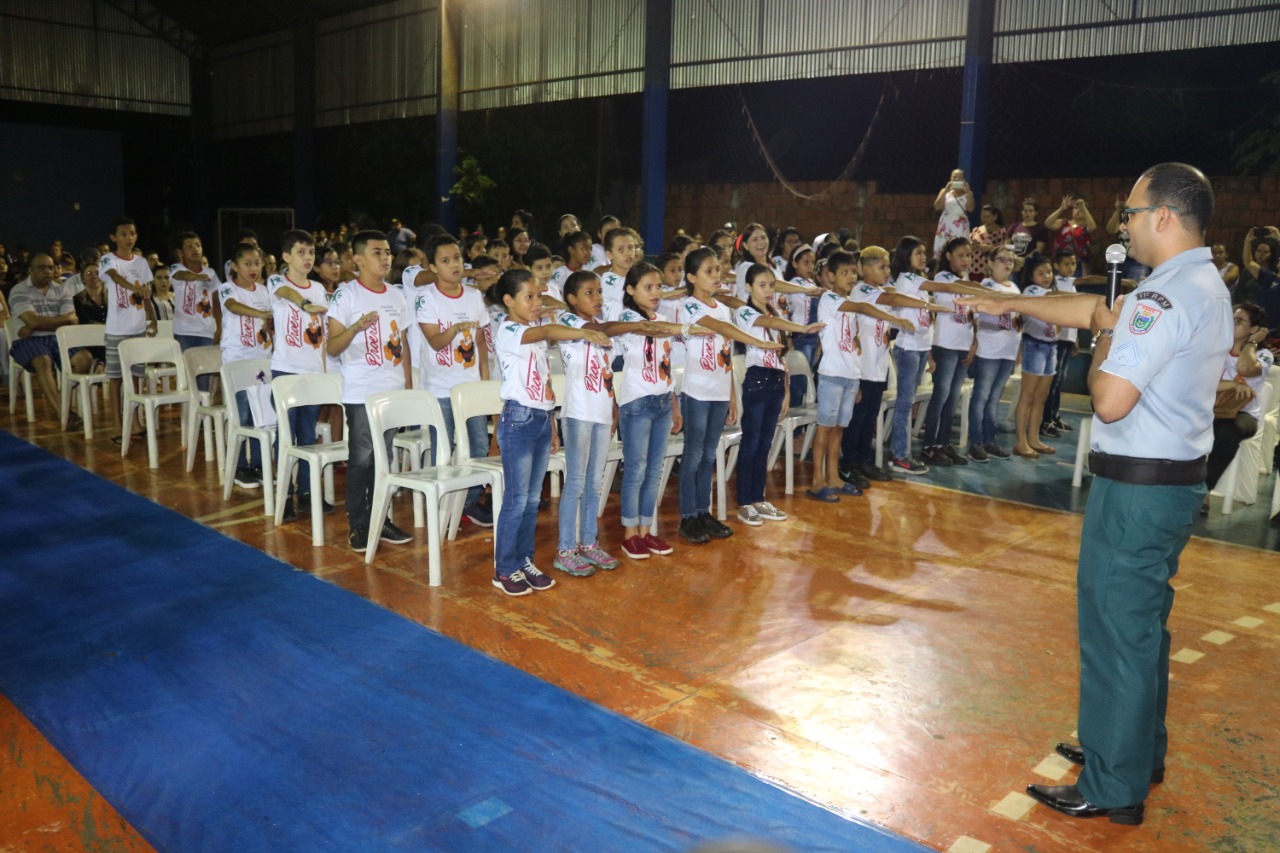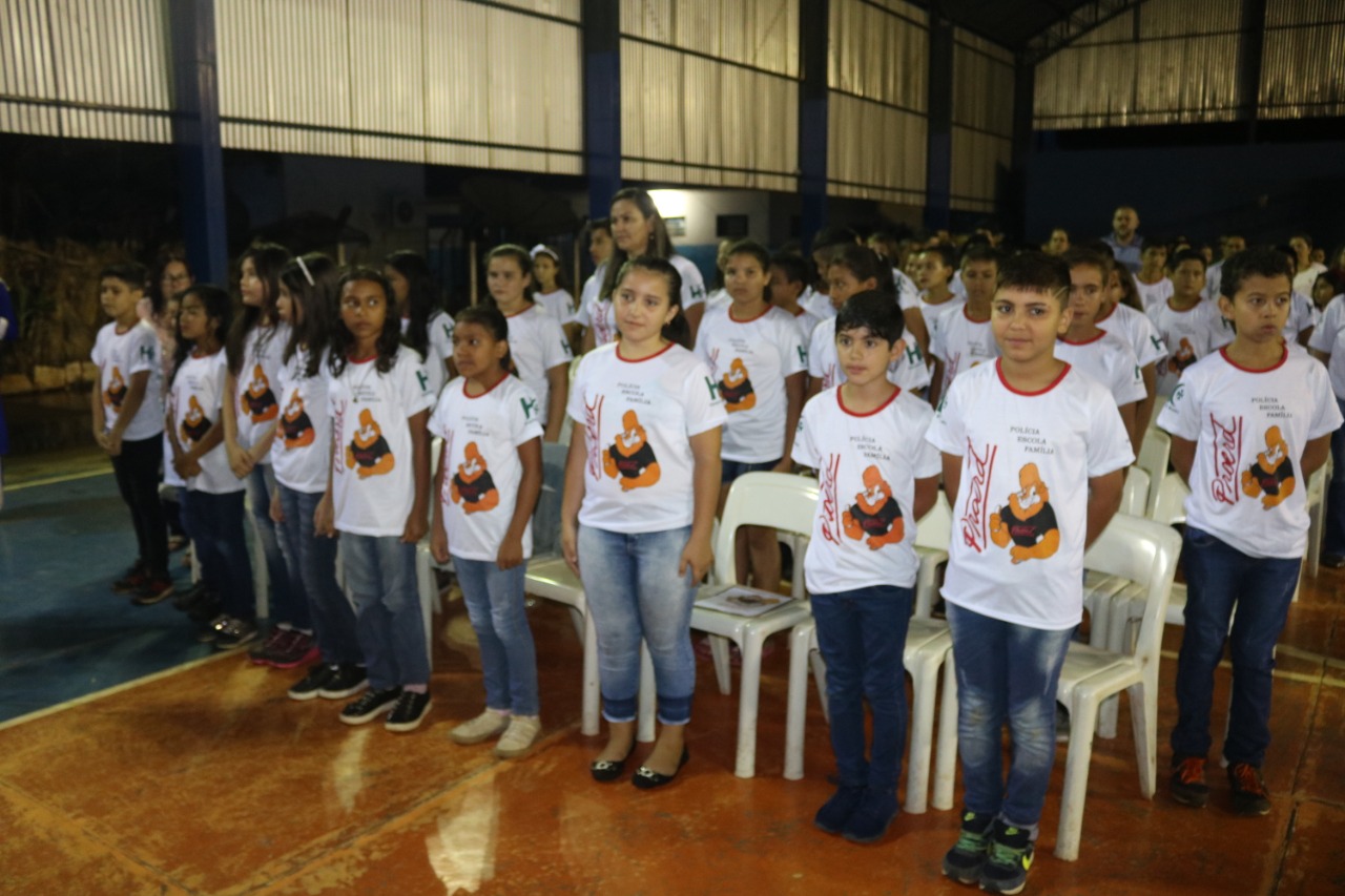 Jardim (MS) – Às 17h30 de ontem (13), foi realizada a Solenidade de Formatura do PROERD em Jardim. O evento foi realizado na quadra poliesportiva da Escola Municipal Major Alberto Rodrigues da Costa (MARC). O projeto, que atendeu e formou 260 alunos de sete escolas da Rede Municipal de Ensino (Zeus Benevides, Estácio Cunha Martins, Rufina Loureiro Caldas, Beracy Brunet Barbosa, Castelo Branco; Oswaldo Fernandes Monteiro e Major Alberto Rodrigues da Costa), esteve sob a coordenação dos instrutores: Cabo PM André Barbosa Rios e Cabo PM Antônio Carlos Olasar de Andrade, durante o ano letivo de 2019.
