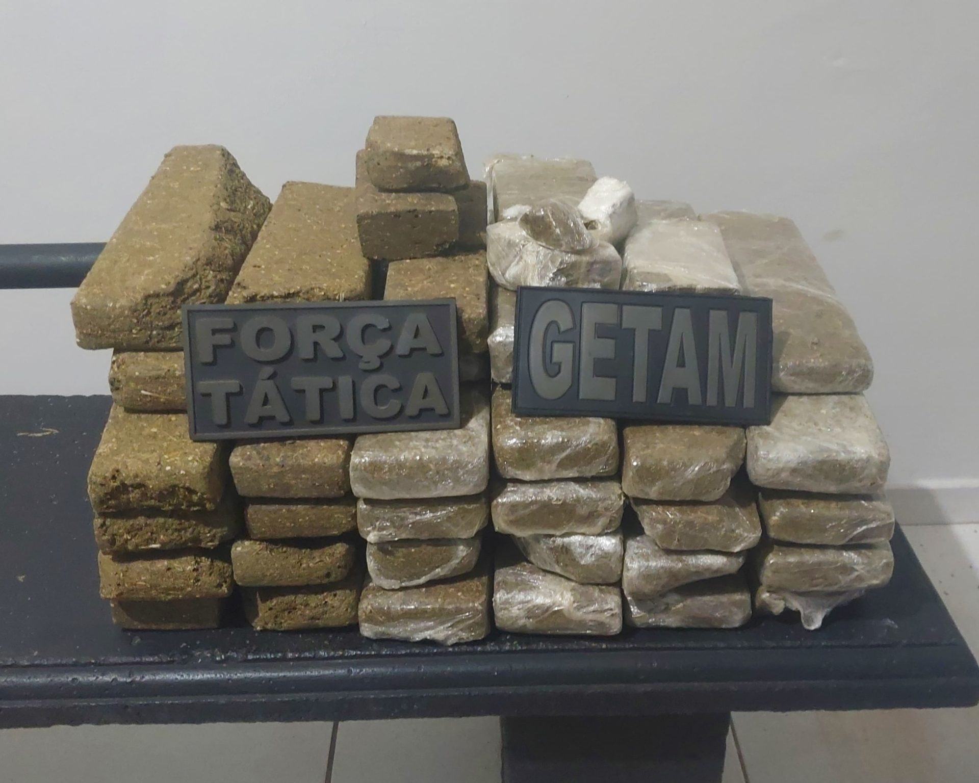 Nesta terça-feira, por volta das 16h, durante policiamento a guarnição da Força Tática e GETAM do 2º BPM, quando na rua A, no bairro Real Park, os policiais visualizaram um indivíduo de 24 anos que ao notar a presença policial entrou rapidamente em um imóvel, deixando cair ao solo 2 tabletes de maconha e 1 aparelho celular. De imediato foi realizado a abordagem policial onde em vistoria no perímetro os militares encontraram em um dos cômodos da residência 27 kg de maconha (totalizando 40 tabletes) e 1 balança de precisão, usada para pesar a droga.