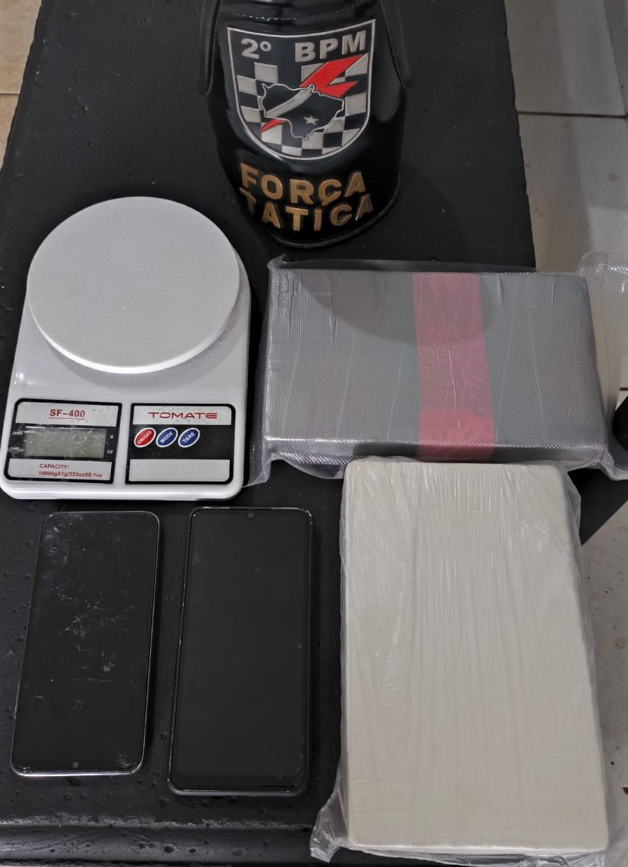 Durante a abordagem foi localizada junto ao abordado uma bolsa contendo 2 tabletes de cocaína e uma balança de precisão. Indagado sobre a substância, o abordado confirmou a traficância e o valor cobrado pelo quilo do entorpecente, informando ainda ter vendido 4 kg da mesma droga para um indivíduo de Jales-SP.
