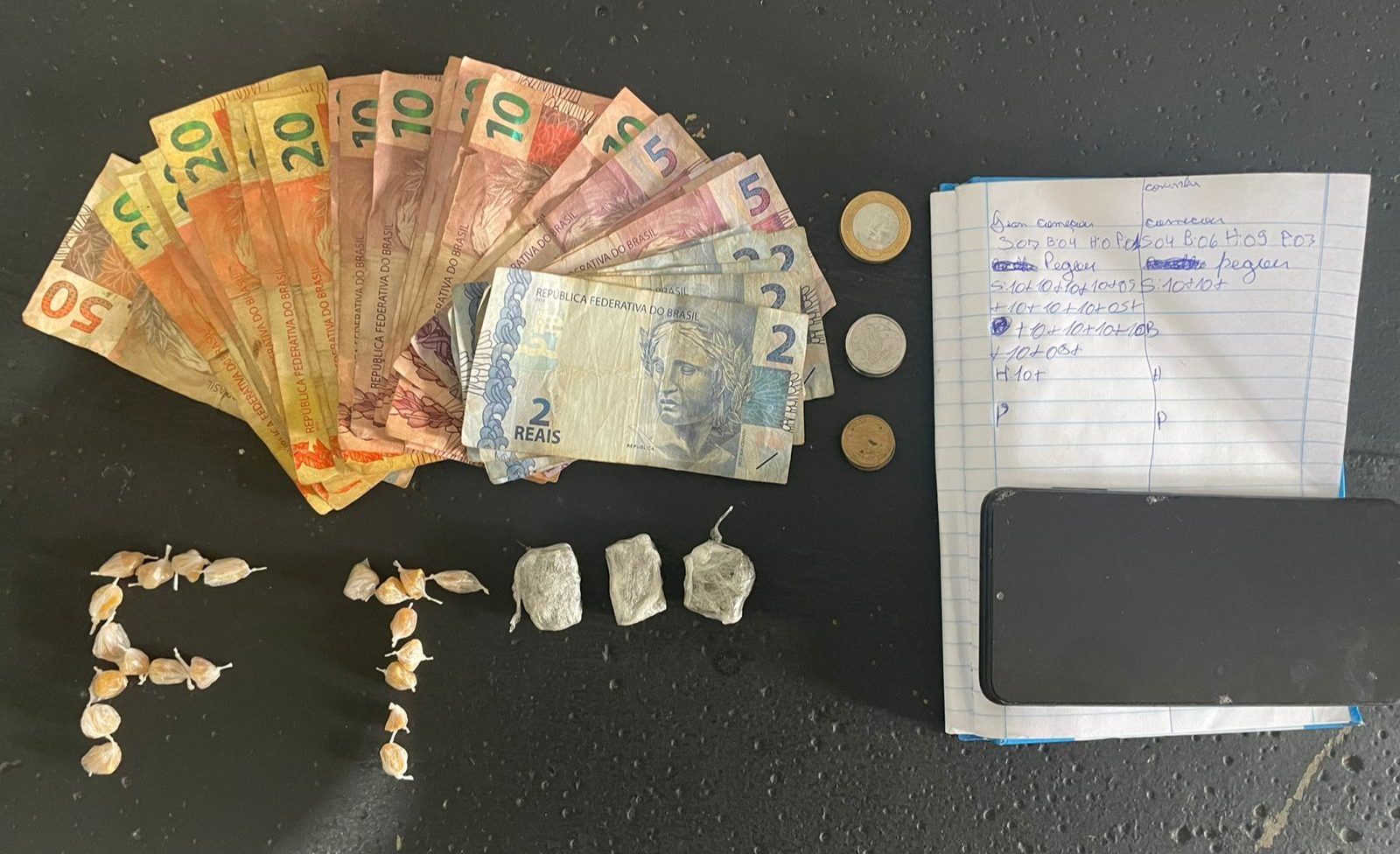 Neste sábado, por volta das 10h45, uma guarnição da Força Tática do 2º BPM durante rondas ostensivas e preventivas no bairro Novo Oeste, quando na rua Joaquim Claudino da Silva, visualizou quatro indivíduos do sexo masculino ao lado de um estabelecimento conhecido por diversas ocorrências do crime de tráfico de drogas. Ao perceberem a aproximação da viatura policial, os indivíduos e empreenderam fuga, sendo acompanhados pelos policiais que lograram êxito na detenção de um adolescente infrator de 16 anos, que durante a fuga dispensou ao solo a quantia de R$120,00 (cento e vinte reais) e 1 caderno contendo anotações aparentemente relacionadas ao comércio de entorpecentes, sendo localizado em seu bolso 3 porções de maconha (pesando 6,8 gramas), tendo ainda detido um adolescente infrator de 17 anos, que durante a perseguição dispensou a quantia de R$220,20 (duzentos e vinte reais e vinte centavos) e 1 invólucro contendo 21 porções de crack (pesando 5 gramas).