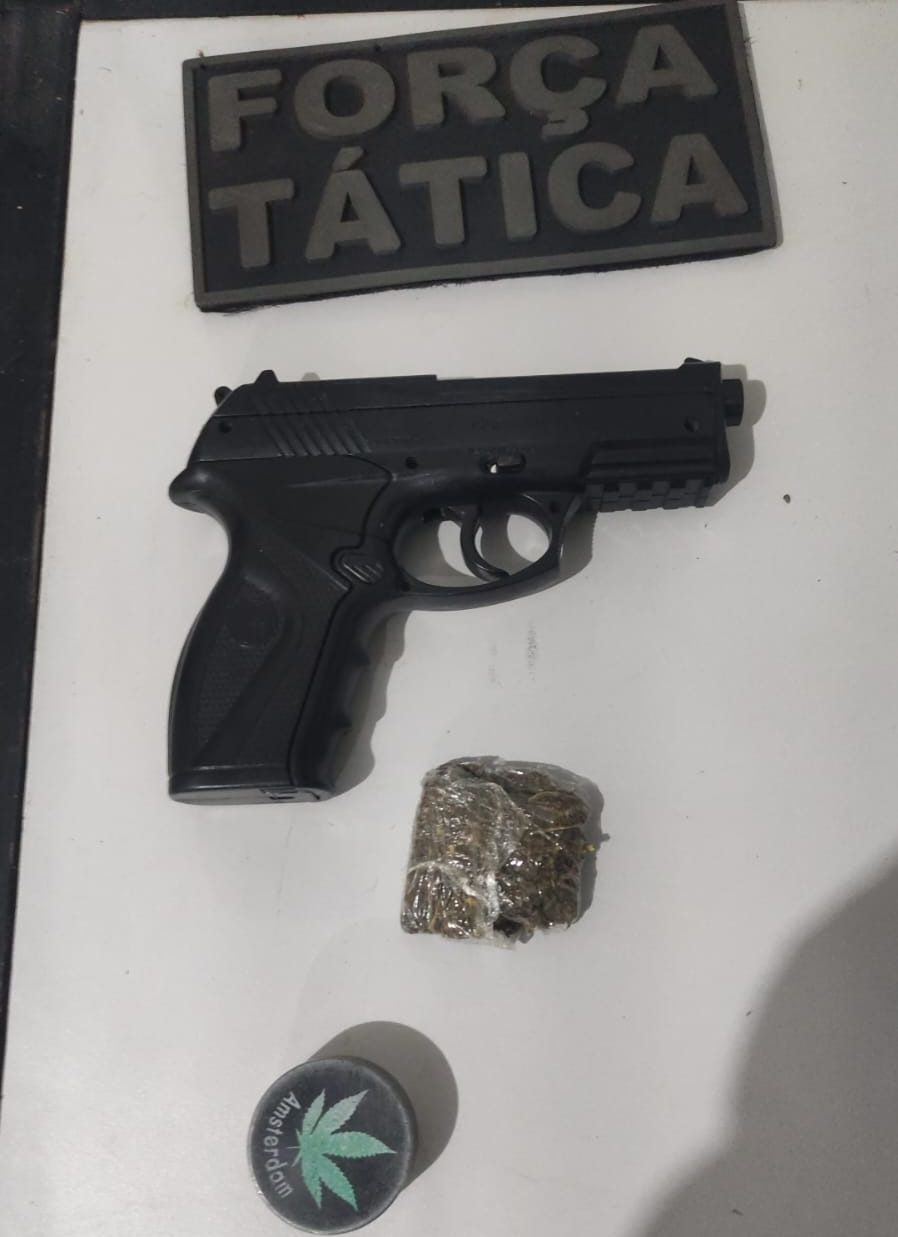 Durante busca pessoal foi localizado em sua posse uma porção de substancia análoga a maconha (pesando 20 gramas) e um dichavador, sendo então realizado sua condução até a Delegacia de Polícia onde foi apresentado juntamente com a droga e o simulacro de arma de fogo.