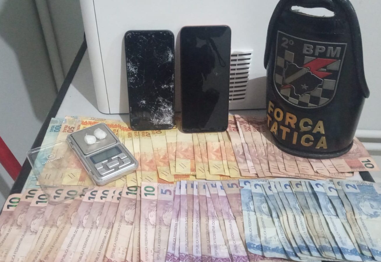 Durante a busca pessoal os policiais vieram a localizar com o usuário 2 “trouxinhas” de cocaína (pesando 1.4 gramas) e com o traficante (de 36 anos) a quantia de R$ 922.00, sendo constatado que o detido é reincidente no crime de tráfico de drogas, tendo sua última detenção realizada há menos de um mês em 22/12/2024, no mesmo local que foi detido na presente situação.