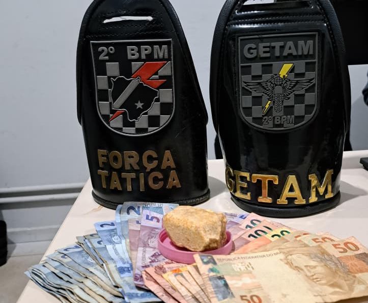 Quando na rua Manoel Antônio Jeremias com a rua Washington José da Costa realizou a abordagem policial de um indivíduo de 19 anos, o qual ao perceber a aproximação dos policiais empreendeu fuga, porém, foi alcançado e detido logo após ter “dispensado” um recipiente que trazia consigo, contendo substância análoga ao crack (pesando 53 gramas).