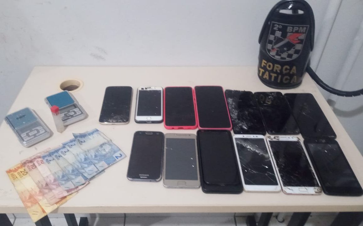 Durante a abordagem ficou constatado que o autor repassava algumas pedras de crack, tendo o casal declarado serem usuários de entorpecente e teriam adquirido a droga do detido, onde em vistoria no perímetro os policiais localizaram oculto dentro de um tênis 2 balanças de precisão, além de 12 celulares que teriam sido trocados por porções de droga.