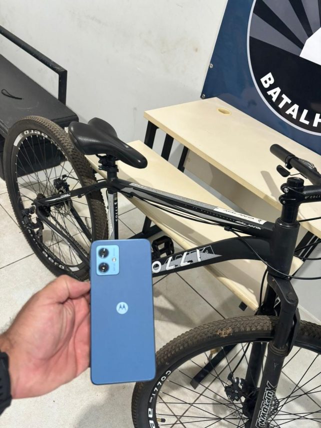 Durante entrevista o abordado (adolescente infrator de 17 anos) relatou seu envolvimento no crime e entregou os objetos provenientes do roubo ocorrido no dia 23 de março, sendo 1 bicicleta da marca Colli e 1 aparelho celular da marca Motorola, Moto G54, que se encontravam em seu apartamento, tendo ainda identificado o segundo autor.