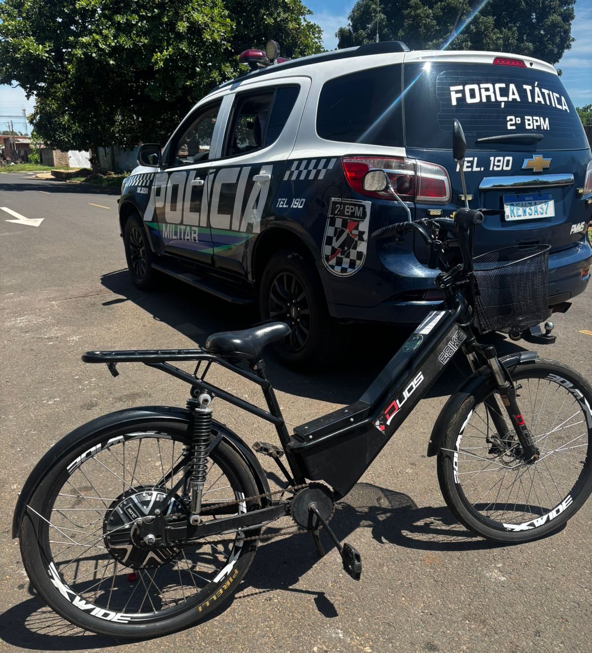 Durante diligência os militares deslocaram até a rua Benedito Soares da Mota, onde visualizaram uma bicicleta elétrica com as mesmas características, na varanda da residência, onde a moradora (mulher de 29 anos) ao ser questionada sobre a origem do bem, informou que a bicicleta havia sido adquirida pelo seu marido, não sabendo seu paradeiro. Em consulta nos sistemas policiais constataram que a moradora e seu marido (homem de 31 anos) possuem passagens policiais pelos crimes de tráfico de drogas, receptação, entre outros.