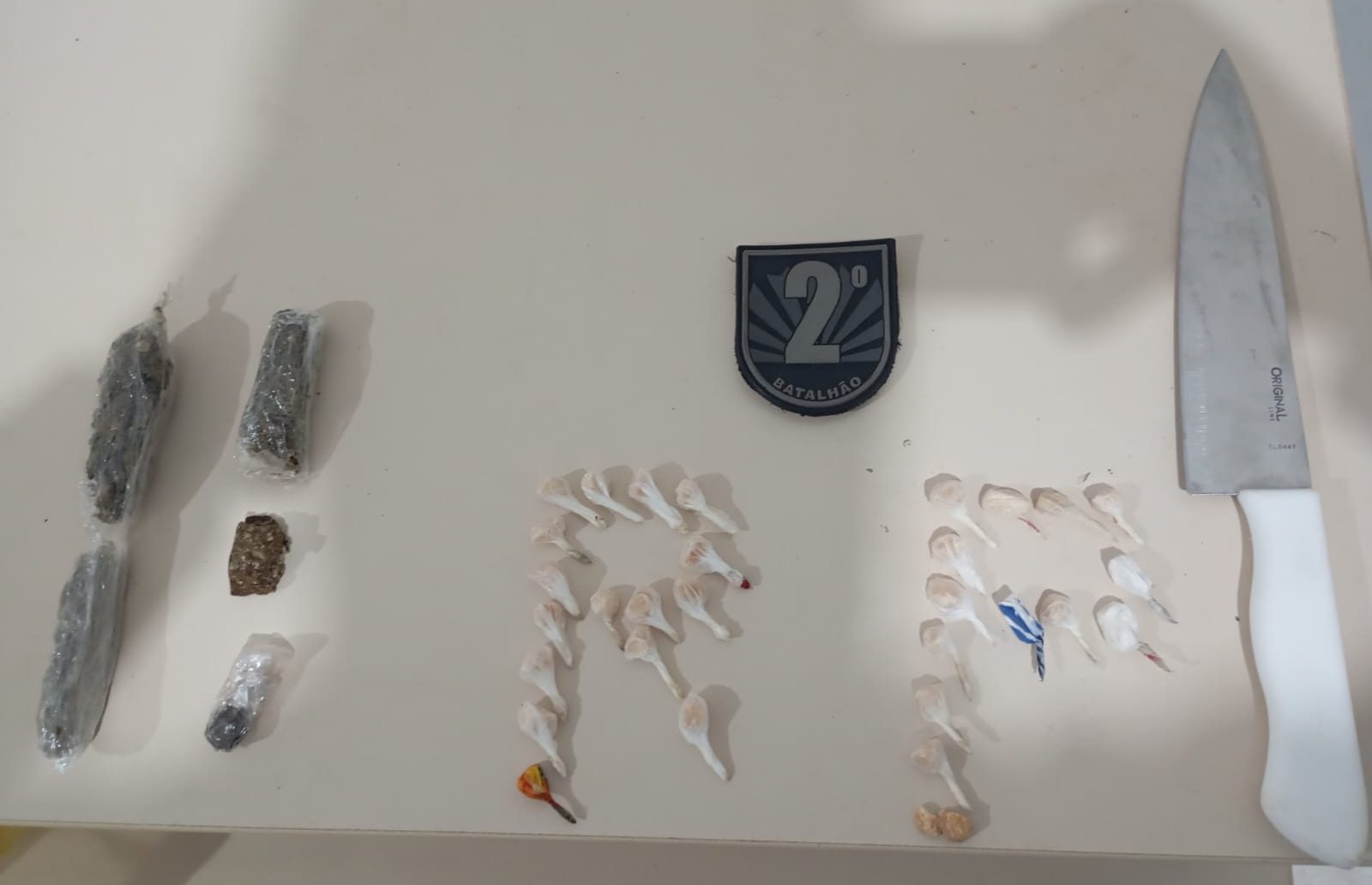 Nesta sexta-feira, por volta das 17h, uma guarnição de radiopatrulha do 2º BPM durante patrulhamento no bairro Santa Rita realizou a abordagem policial de um masculino de 18 anos, onde durante busca pessoal vieram a localizar em um de seus bolsos 1 embalagem contendo cocaína e 3 “trouxinhas” de maconha, e ao ser questionado sobre os entorpecentes o jovem apontou o local, onde durante diligências na rua Sebastião Fenelon Costa, no bairro São João, os policiais lograram êxito na localização e detenção de um masculino de 27 anos, que foi autuado em flagrante pelo crime de tráfico de drogas.