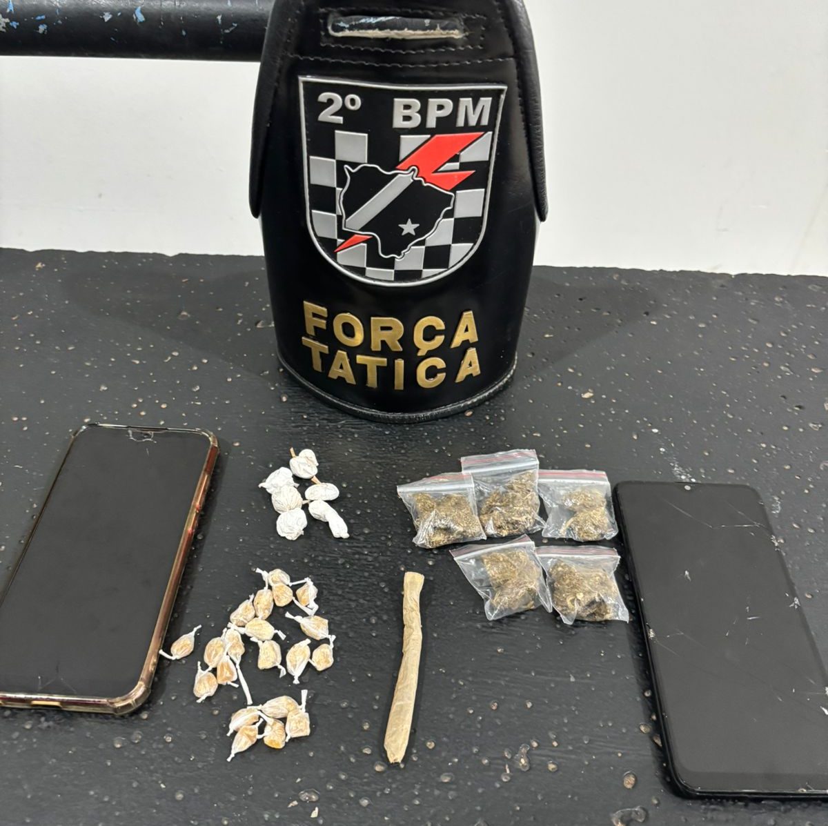 Durante a abordagem policial os militares vieram a localizar próximo a estes um cigarro de maconha, onde ao ser questionado o abordado de 18 anos, admitiu a venda do entorpecente, bem como apontou o local onde os policiais vieram a localizar 5 porções de maconha (totalizando 12,3 gramas), 20 porções de crack (totalizando 4,8 gramas) e 6 porções de cocaína (totalizando 4,5 gramas).
