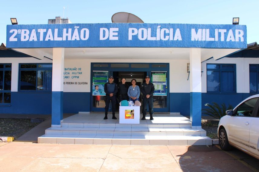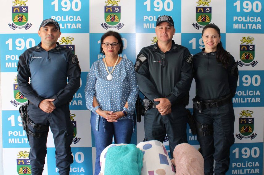A entrega dos itens a presidente da Vila Vicentina de Três Lagoas, Sra. Jane Ferreira e Silva Zuque foi realizada pelo Comandante do 2º BPM, Tenente Coronel PM Ormay, acompanhado do Subcomandante Major PM Rogeliano.