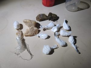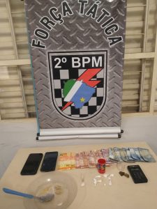Diante da materialidade para o Crime de Tráfico de Drogas, a equipe deslocou até a residência e realizou a abordagem da acusada e após buscas foram encontradas: 09 trouxinhas com cocaína, 02 pedras de crack em um prato, 02 porções de maconha, 01 máquina de cartão, cédulas de dinheiro nacional e 01 aparelho de telefone celular, que após ser checado constatou ser produto de Roubo, logo a mulher também responderá pelo Crime de Receptação.