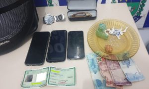 No local, também foram localizados sobre o sofá da sala, 01 prato e 01 faca com resquícios de Crack, além da quantia de R$ 117,00, 03 telefones celulares, 02 relógios e 01 aparelho de som de origem desconhecida.