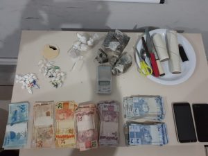 Ao acessarem o interior do imóvel também foram apreendidos balança de precisão, prato e instrumentos de corte (faca e tesoura) no interior da geladeira, e ainda várias porções de maconha e cocaína espalhadas pela casa. Além da apreensão do material ilícito, houve confissão espontânea dos usuários alegando estarem no local para adquirir drogas. Logo, todos os abordados foram conduzidos à Delegacia sendo o responsável autuado pelo crime de Tráfico de Drogas e Corrupção de Menores.