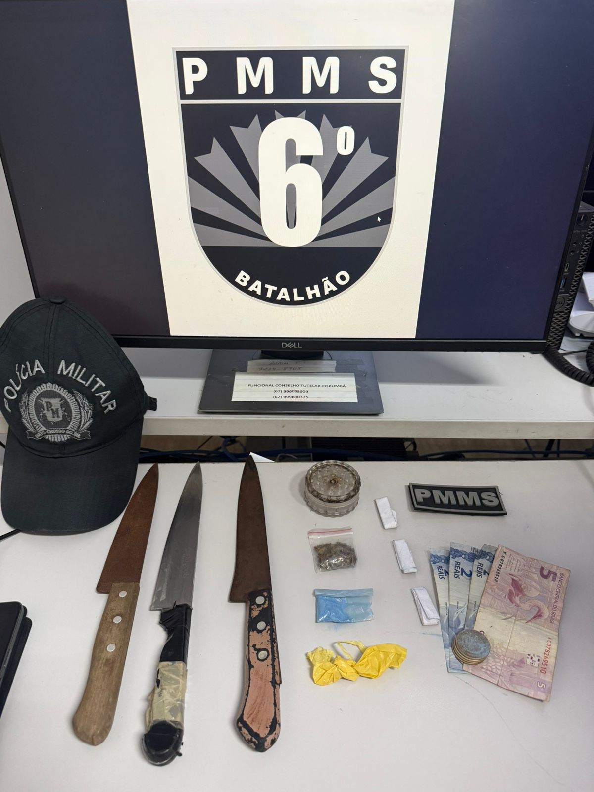 A Polícia Militar de Mato Grosso do Sul apreendeu, na manhã de sábado (3 de janeiro), drogas, armas brancas e outros objetos durante patrulhamento ostensivo realizado na região central de Corumbá.