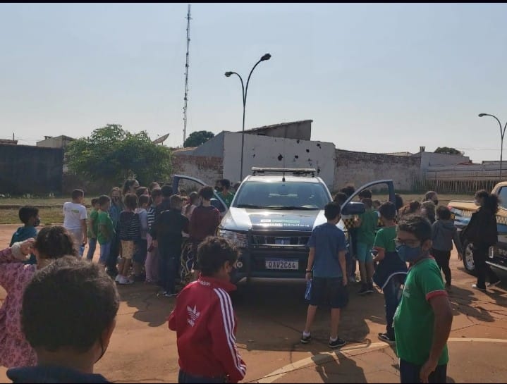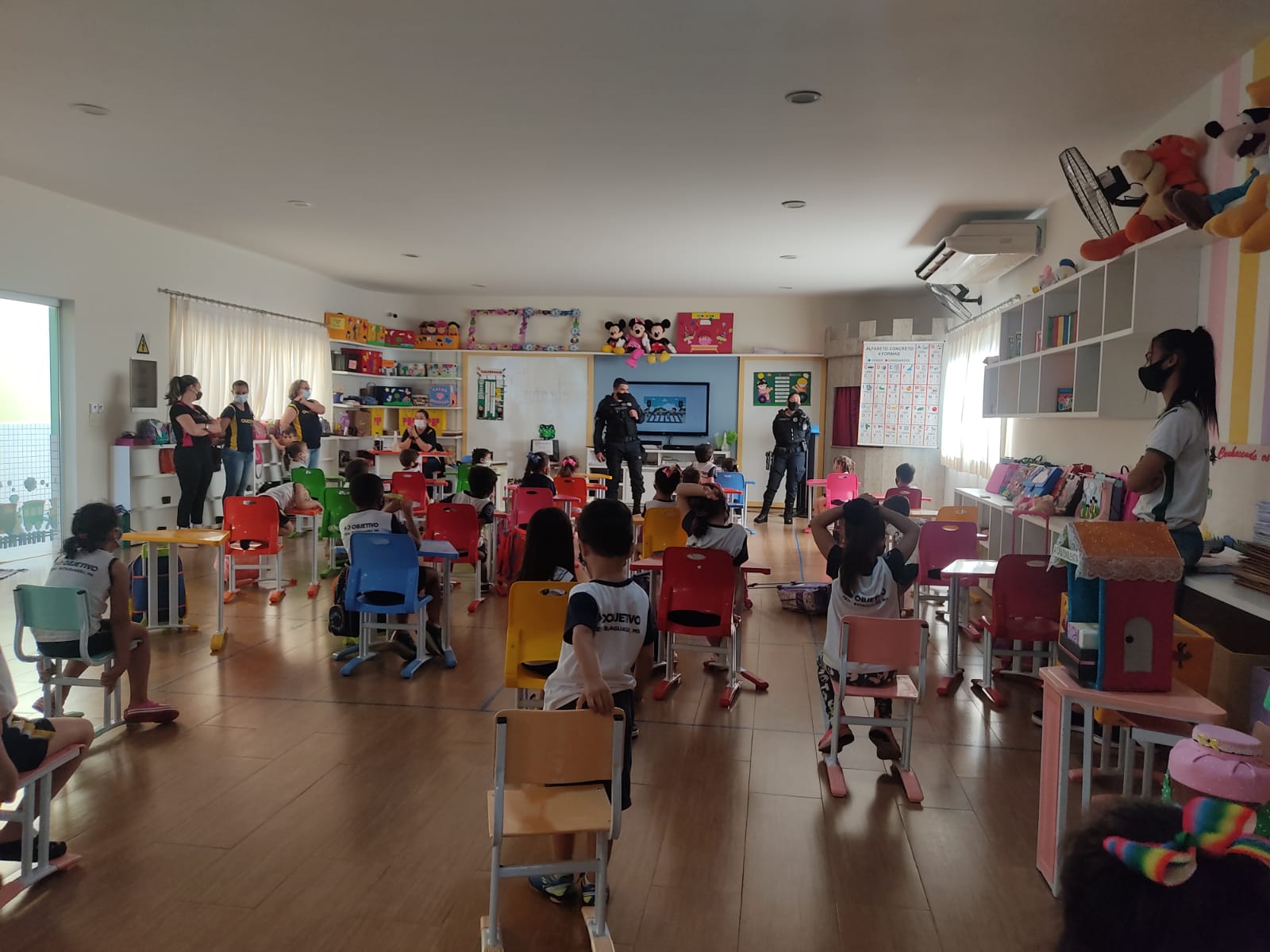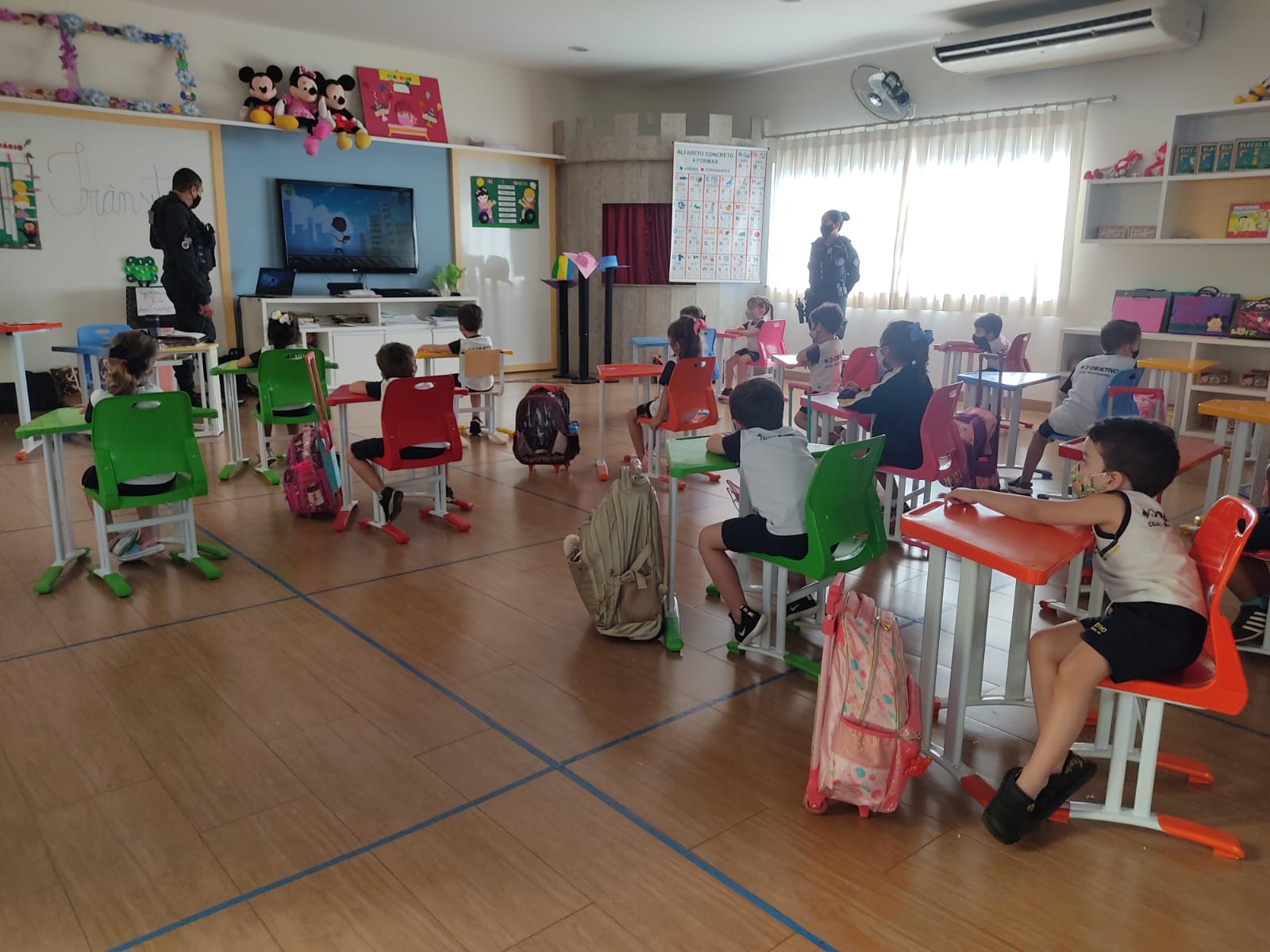 No período da tarde, os policiais estiveram no colégio CEJA Objetivo, onde ministraram uma palestra aos alunos do ensino infantil.