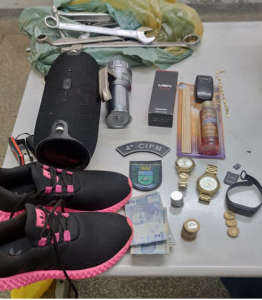 Após abordagem e busca pessoal foi localizado em seu bolso: dinheiro, dois relógios, uma pulseira, um celular e um chinelo feminino.