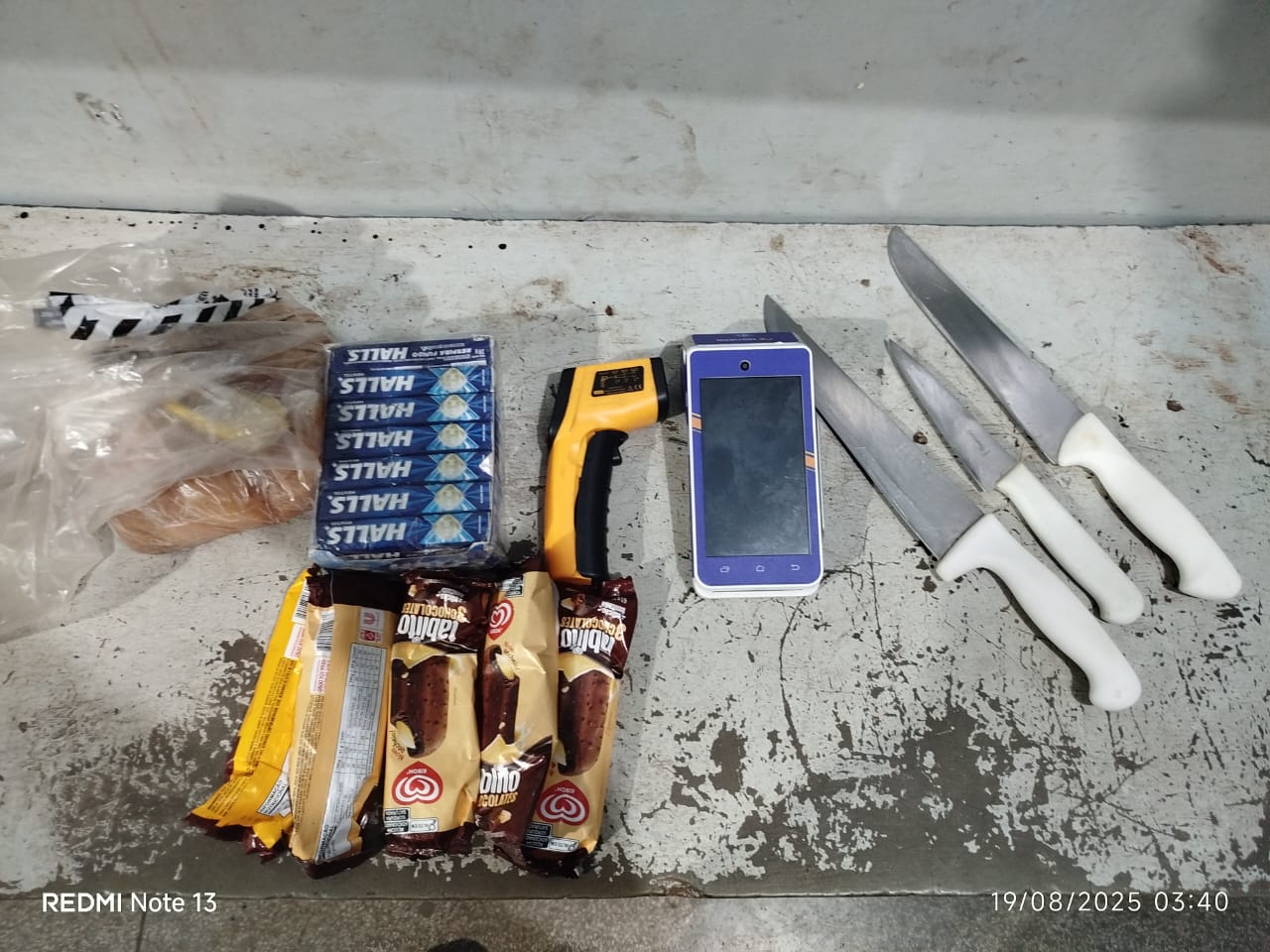 Após resistência inicial, foi possível efetuar a detenção do indivíduo por meio de acesso alternativo ao interior do restaurante, preservando a integridade física tanto da equipe quanto do próprio autor. Na vistoria, os militares encontraram diversos objetos já separados para subtração, entre eles alimentos, facas, uma máquina de cartão e outros itens do comércio.
