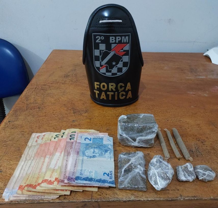 Durante a busca pessoal os policiais localizaram em seus bolsos, 2 (dois) invólucros de substância esverdeada análoga a maconha pesando 7 gramas, uma latinha de metal, contendo 3 (três) cigarros de maconha pesando 6 gramas e várias cédulas de dinheiro nacional, totalizando R$ 607,00 (seiscentos e sete reais), sendo localizado ainda em sua mochila 03 (três) tabletes da mesma substância pesando 141 gramas e uma faca de mesa com resquícios de droga.