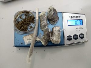 Durante o patrulhamento preventivo pelas ruas da cidade a guarnição deparou com um veículo de marca Fiat parado, porém o motor estava ligado. Ao avistar a viatura o condutor demonstrou certo nervosismo saindo com o veículo sendo abordado pela guarnição logo em seguida. Durante uma revista no veículo foi localizado uma porção de maconha, um cigarro de maconha e uma porção de cocaína, além de diversos apetrechos utilizados no consumo da droga.
