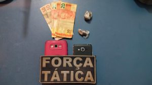 Ao realizar a busca pessoal no condutor foi localizado no bolso, uma porção de maconha e a quantia de R$140,00 reais distribuídos em 02(duas) cédulas de R$50,00 e 02 (duas) cédulas de R$20,00. Já em busca pessoal no passageiro nada de ilícito foi localizado, sendo que ao realizar a consulta de ambos no sistema policial, foi localizado um mandado de prisão contra o passageiro de 23 anos.