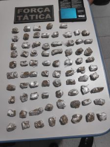 Com sua autorização a equipe da Força Tática fez buscas na residência e encontrou 30 parangas de maconha embaladas e prontas para a venda dentro do fogão, também foi encontrado na cozinha da casa balança de precisão e mais 46 parangas em uma bolsa que estava dentro do quarto. Que após pesagem totalizou 325 gramas de maconha.