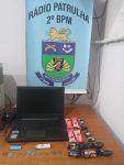Nesta sexta-feira, por volta das 00h40, uma guarnição de radiopatrulha do 2º Batalhão durante policiamento preventivo a fim de inibir furtos no comércio, visualizaram um casal que ao perceberem a presença dos policiais demonstraram suspeição tomando destino opostos, sendo então realizado a abordagem da mulher que alegou não conhecer o masculino. Durante a abordagem da mulher os militares não perderam o masculino de vista e visualizaram quando este adentrou uma empresa de moto táxi onde em contato com funcionários estes relataram que o masculino de 29 anos, havia lhes oferecido 01 Note book que retirou de baixo da blusa.