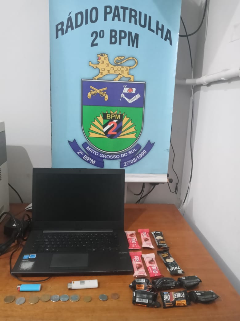 Durante abordagem do masculino foi localizado em sua posse 01 Notebook, algumas barras de cereais e doces, e certa quantia de dinheiro, instante em que declarou que o Note book pertencia a mulher abordada anteriormente, vindo esta a declarar que o masculino teria furtado de uma loja. Em diligências a guarnição se deslocou na loja que haviam furtado e após contato com os proprietários os quais ao verificar o circuito interno do local constataram que a mulher havia adentrado o comércio, indo até o caixa de onde retirou dinheiro e o masculino teria se dirigido ao fundo da loja e pego 01 Note book, sendo percebido a falta ainda de alguns produtos alimentícios e 01 aparelho celular.
