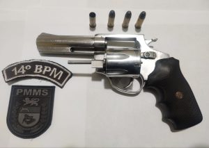 A guarnição policial foi informada por populares de que um homem em uma caminhonete havia realizado disparos de arma de fogo em um evento realizado na área central. No local os policiais viram o veículo com as mesmas características saindo. De imediato foi realizado abordagem, o condutor foi identificado, ao realizar vistoria veicular, foi localizado debaixo do tapete do lado do passageiro onde estava sentado a testemunha, um revólver da marca ROSSI – calibre .38 SPECIAL com 03 (três) munições intactas e 01 (uma) deflagrada. O proprietário do veículo disse ser o dono da arma e assumiu que realmente efetuou um disparo. Diante do exposto o envolvido foi encaminhado para Delegacia de Polícia Civil para as providencias cabíveis.