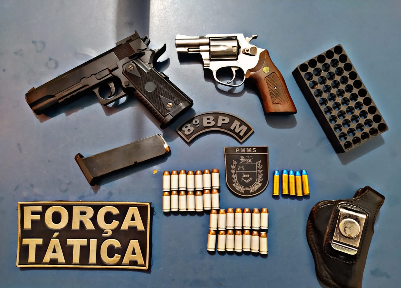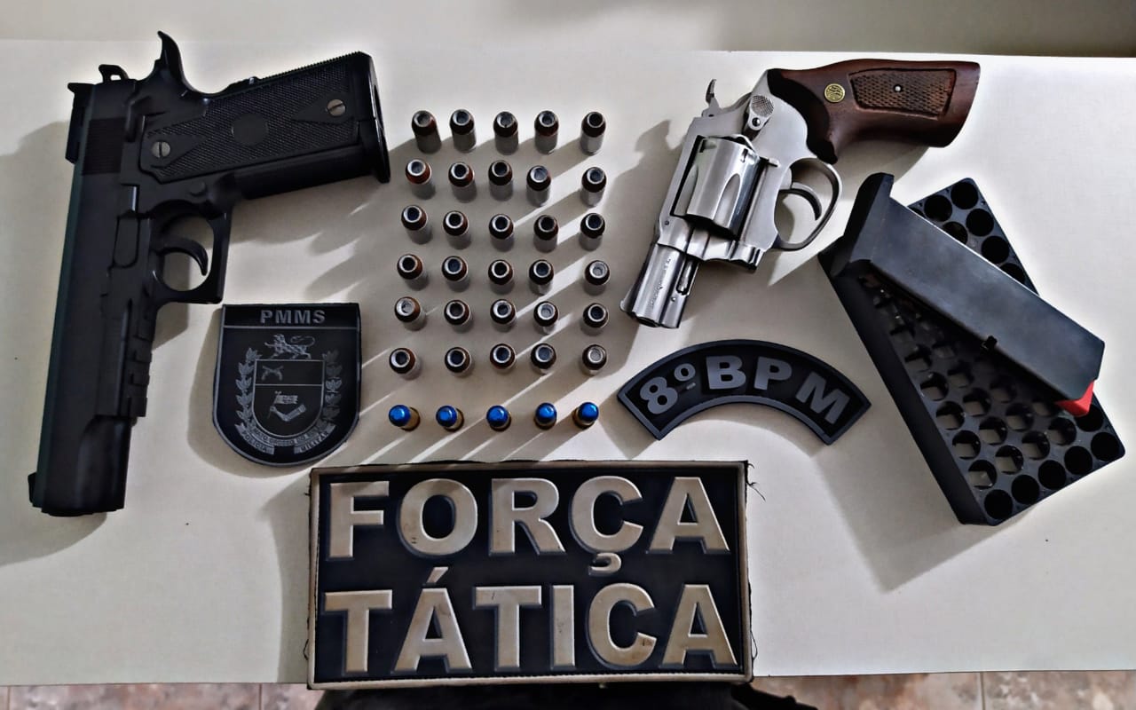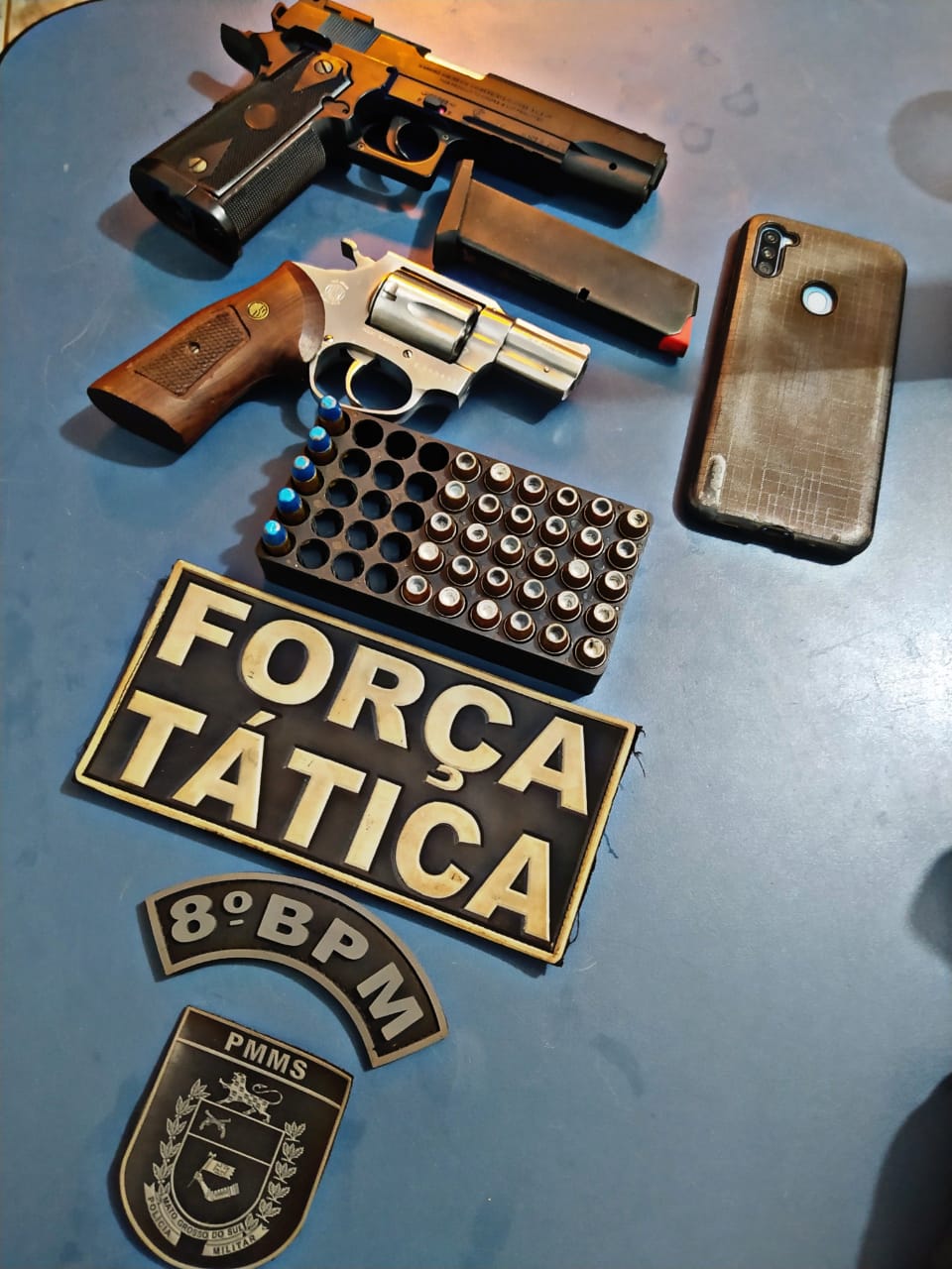 Diante da constatação dos policiais, foi realizada a busca no veículo sendo localizado em cima do banco do motorista um revólver calibre .38 com 05 munições compatíveis com o calibre da arma e um simulacro de arma de fogo. Questionado ao autor se possuía registro ou posse da referida arma de fogo, sendo declarado que não, e que a arma era irregular. Questionado, ainda, se ele possuía mais munições, o autor que sim e que estariam na sua casa debaixo do sofá da sala, e que seriam munições calibre .45 e um carregador no guarda-roupa. Em posse das informações, as equipes policiais deslocaram até o local indicado e com a autorização adentraram a residência onde foi localizado os petrechos relatados. Diante dos fatos foi dada voz de prisão ao autor que foi conduzido até a delegacia de Polícia de Nova Andradina.