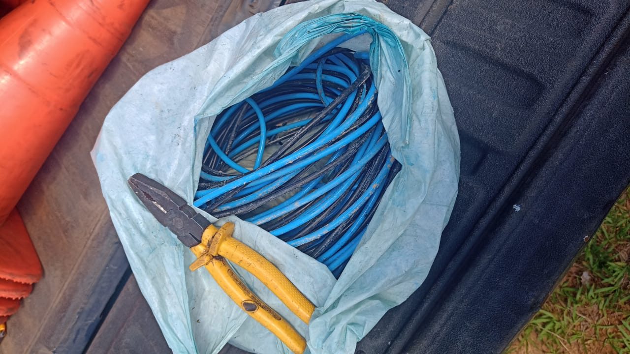 Ao chegarem ao local, os policiais encontraram o autor ainda em flagrante. Ele portava uma sacola contendo os fios furtados e um alicate de corte, utilizado para cometer o crime.