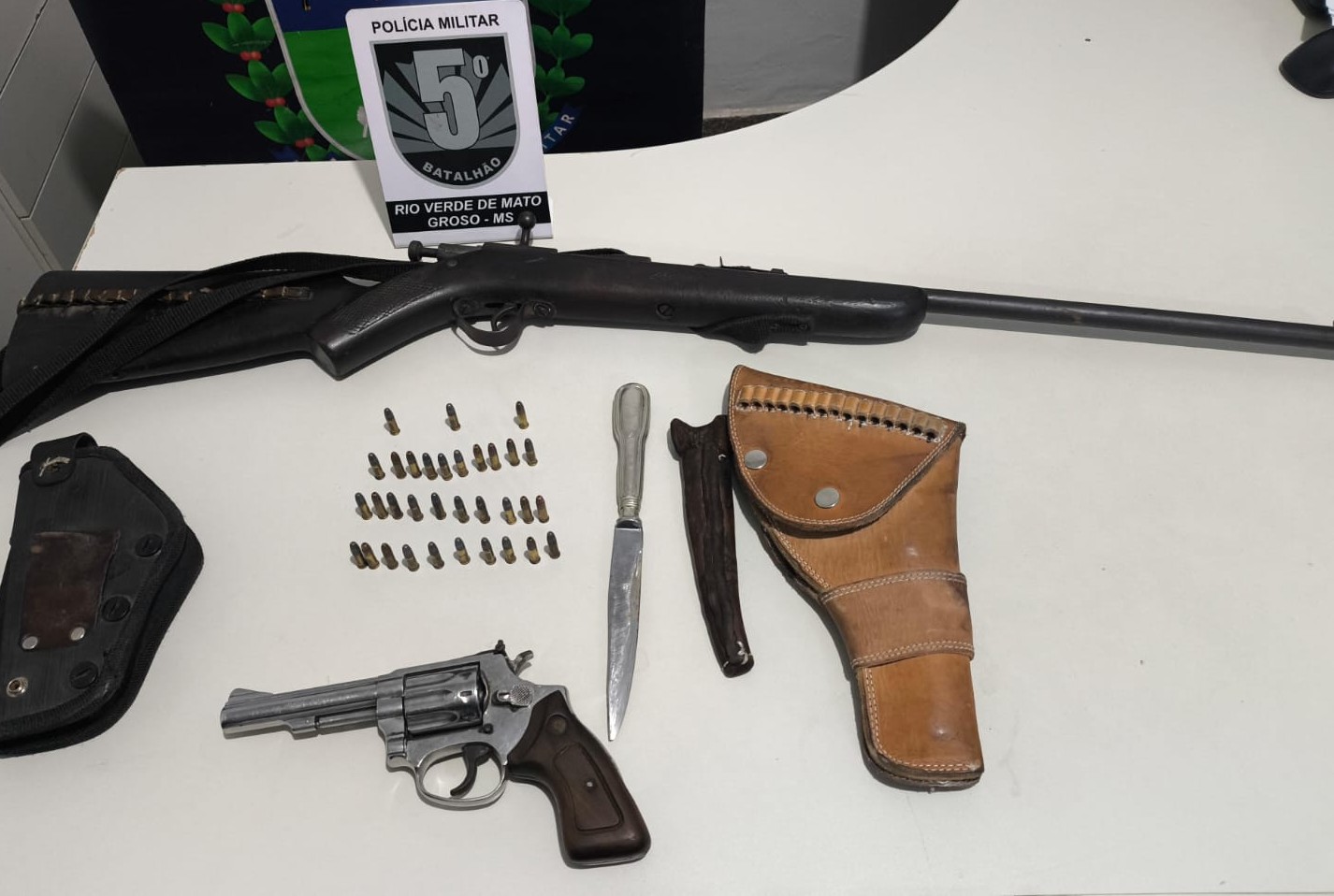 Com o apoio de outra guarnição, os militares foram até o endereço e localizaram o suspeito. Durante a busca no imóvel, os policiais encontraram um revólver, uma espingarda calibre .22, diversas munições e coldres.