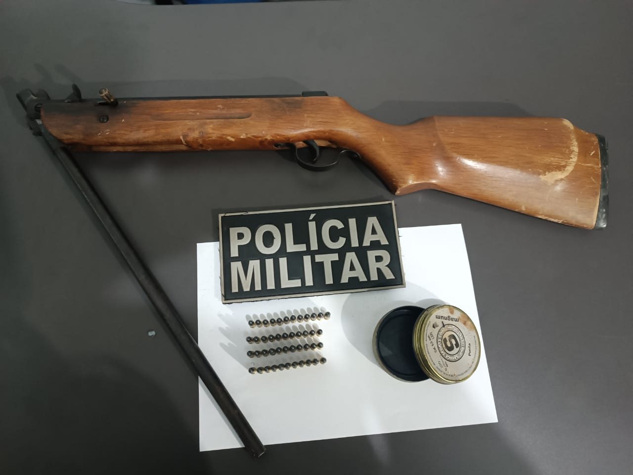 Ao chegar ao local, os militares localizaram o suspeito e, durante a abordagem, apreenderam uma espingarda calibre .22 e 45 munições do mesmo calibre.