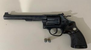 Em busca veicular foi localizado no assoalho, 01 revólver cal. 38 com 02 munições intactas, e sem registro. Logo, recebeu voz de prisão e foi conduzido par delegacia onde irá responder pelos crimes de porte ilegal de arma de fogo e dirigir sob influência de álcool.