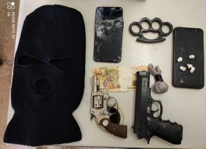 Chapadão do Sul (MS) – Ás 10h0min desta sexta-feira (14/05) a Polícia MIlitar realizava patrulhamento preventivo pela avenida Goiás, e se deparou com um indivíduo, conhecido no meio policial, transitando a pé. O jovem de 21 anos é suspeito de ter participado de alguns roubos na cidade e também é apontado como autor de tráfico de drogas. Os militares fizeram abordagem e verificaram que o jovem estava fumando um cigarro de maconha na via pública. No momento da abordagem o homem quebrou o seu aparelho celular, perguntado o motivo, ele respondeu que: “quebrou pois não queria caguetar ninguém”, após essa resposta a equipe que estava fazendo a abordagem supôs que teria mais de uma pessoa envolvida. Depois de procedida a revista, os militares perguntaram se possuía algum tipo de arma de fogo e ele respondeu que tinha e estava em sua casa. Deslocaram até sua residência e com sua autorização adentraram ao imóvel onde o autor mostrou onde estava a arma de fogo, um simulacro de pistola e também uma “touca ninja”. Havia também cinco porções de cocaína e uma de maconha. Diante dos fatos foi conduzido até a Delegacia de polícia para providências.