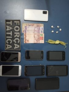 Junto ao entorpecente foi encontrado algumas cédulas de moeda nacional. Ainda durante buscas, dentro de um quarto, em cima de uma cômoda foram localizados vários aparelhos de telefone celular e que segundo o dono do bar foi adquirido por dívidas de drogas.