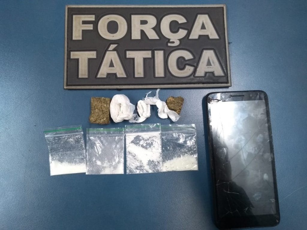 Às 23h os policiais receberam denúncias que nas proximidades de uma conveniência, dois indivíduos estariam comercializando drogas, a equipe da Força Tática, através das informações recebidas se dirigiu até o local denunciado, verificando se tratar de dois adolescentes, que ao serem submetidos à busca pessoal foram localizadas 07 (sete) porções de substância análoga a cocaína e 02 (duas) porções de substância análoga a maconha.