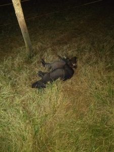 Imediatamente a equipe foi até o local e  no caminho encontraram os três suspeitos em um veículo com placas de Nossa Senhora das Graças-PR, com o capô aberto fazendo reparos no motor. Durante  abordagem e revista pessoal foi observado um forte cheiro e um dos suspeitos estava sujo de sangue, porém não possuía ferimentos. Em entrevista o homem confessou ter matado dois porcos e escondeu no mato para pegar depois, quando o veículo funcionasse. Em buscas pelo local informado os policiais  encontraram os animais na margem da rodovia.