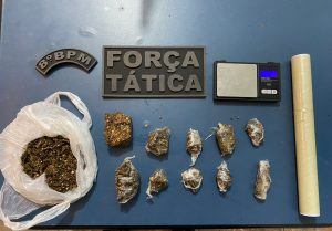 Em entrevista, o jovem disse que adquiriu de outra pessoa nas proximidades do local e pago o valor de R$ 10,00 reais. Os policiais militares deslocaram até o local informado e localizaram o homem em frente à sua residência. Foi realizada a abordagem e busca pessoal onde foram encontradas 02 porções de maconha. Questionado se teria mais entorpecentes, o suspeito confessou que sim e ao realizar a busca no imóvel foram localizadas mais 09 porções de maconha, uma balança de precisão, um rolo de plástico filme para o embalo de entorpecentes. Diante dos flagrantes, foi dada voz de prisão aos autores que foram conduzidos para a Delegacia de Polícia Civil, juntamente com as drogas. objetos e o dinheiro para o registro da ocorrência.