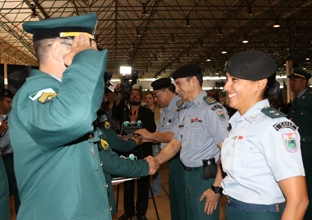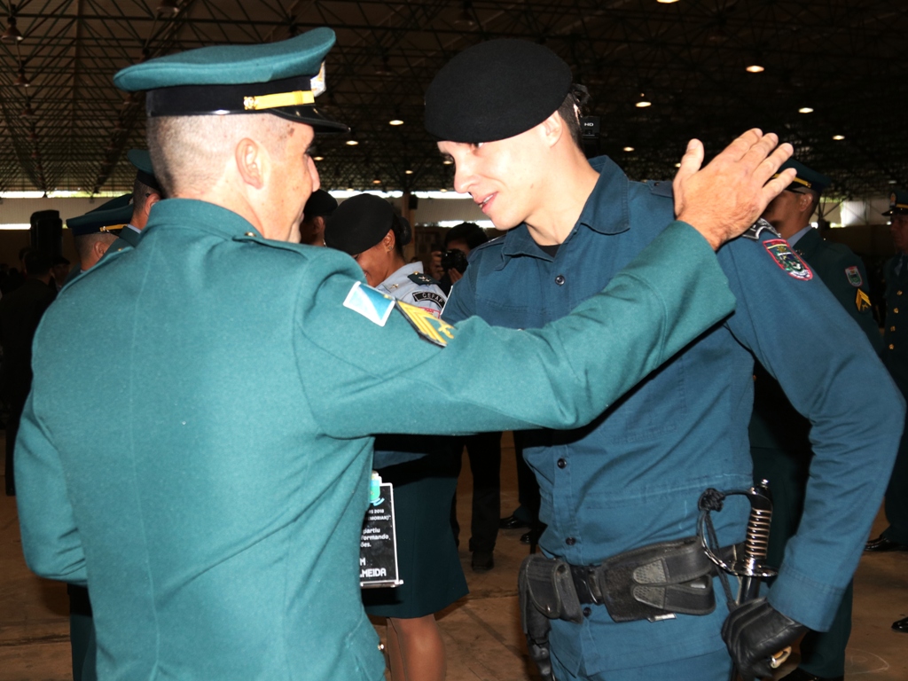 Terceiro colocado, Sargento PM Ricardo Lopes Paulino, com a divisa entregue pelo Comandante Geral da PMMS, Coronel PM Waldir Ribeiro Acosta.