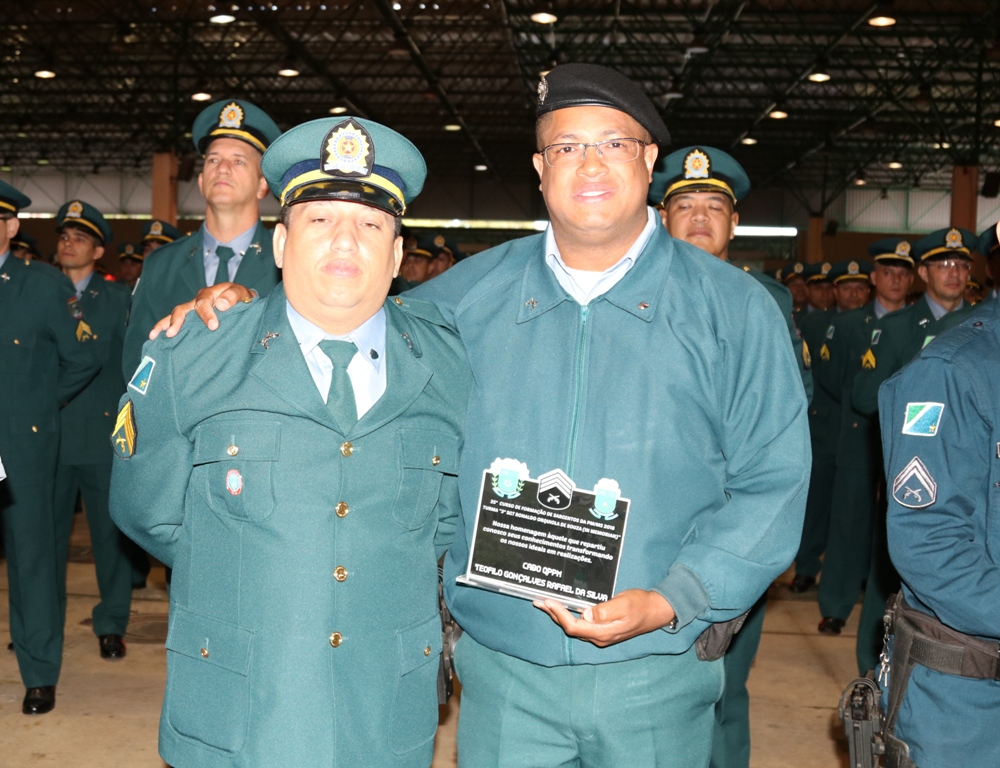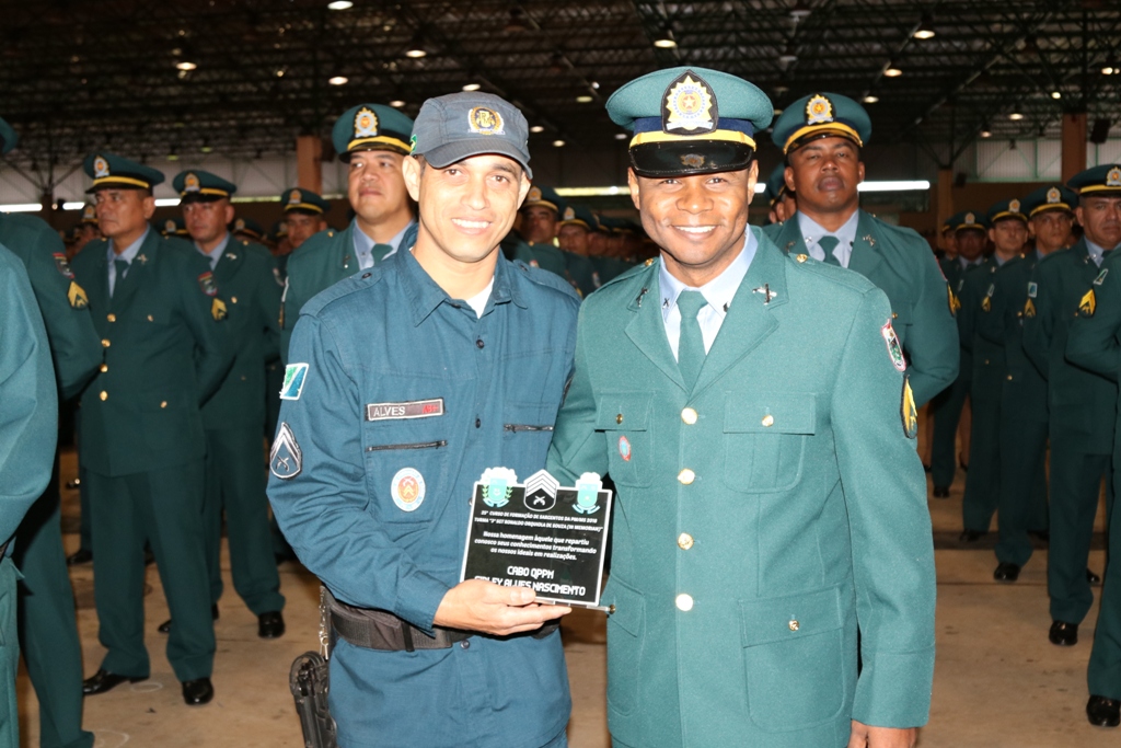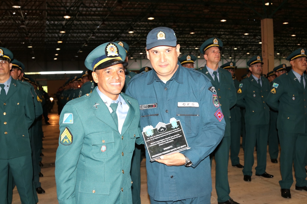 Primeiro colocado, Sargento PM Eduardo Pereira Souza, com a divisa entregue pelo Secretário de Estado de Justiça e Segurança Pública, Delegado Antônio Carlos Videira ;