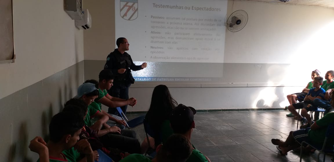 Os policiais militares Cb Cristaldo e Cb Moreira abordaram diversos assuntos como o bullying, a violência no ambiente escolar e o combate às drogas.