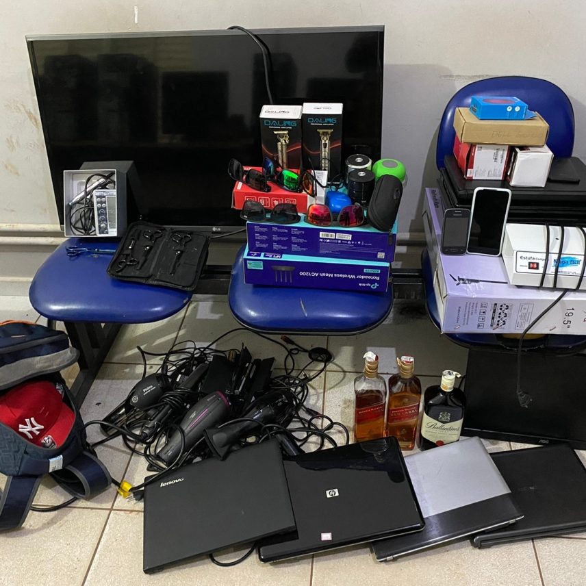 Que perguntado ao autor sobre os objetos dos furtos, o mesmo relatou que a maioria ainda estava em sua posse no interior da residência, no quarto do casal onde foi constatado pela equipe policial. Sendo vários notebooks, uma TV, monitores de computador, celulares e diversos outros produtos, além de nos apresentar também 03 (três) chaves mixas que era utilizada para abrir as trancas dos estabelecimentos.