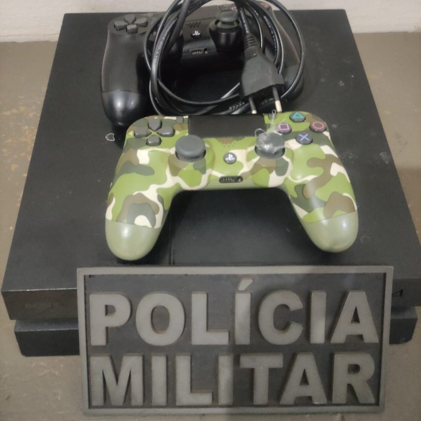 A equipe do Pelotão de Trânsito iniciou diligências e logrou êxito em efetuar a abordagem ao veículo VW Gol vermelho na Rua Custódio Andries número 666 do bairro Santa Terezinha. O condutor foi questionado a respeito do referido objeto e relatou a equipe que estaria no interior da residência embaixo da pia de cozinha. Foi franqueado a entrada na residência pelo autor onde a equipe localizou o objeto no local indicado bem como 2 (dois) controles sem fio (Playstation 4) e um cabo de alimentação de energia. O autor relata ter pago a quantia de R$ 1000 (Mil Reais) pelo aparelho e teria como intenção realizar comércio. Que durante a busca feita no imóvel, perguntado sobre ilícitos, o autor nos mostrou o local na estante da casa, onde fora localizado dois pequenos tabletes de maconha pesando 28g (vinte e oito gramas), droga esta que relatou ser para seu consumo.